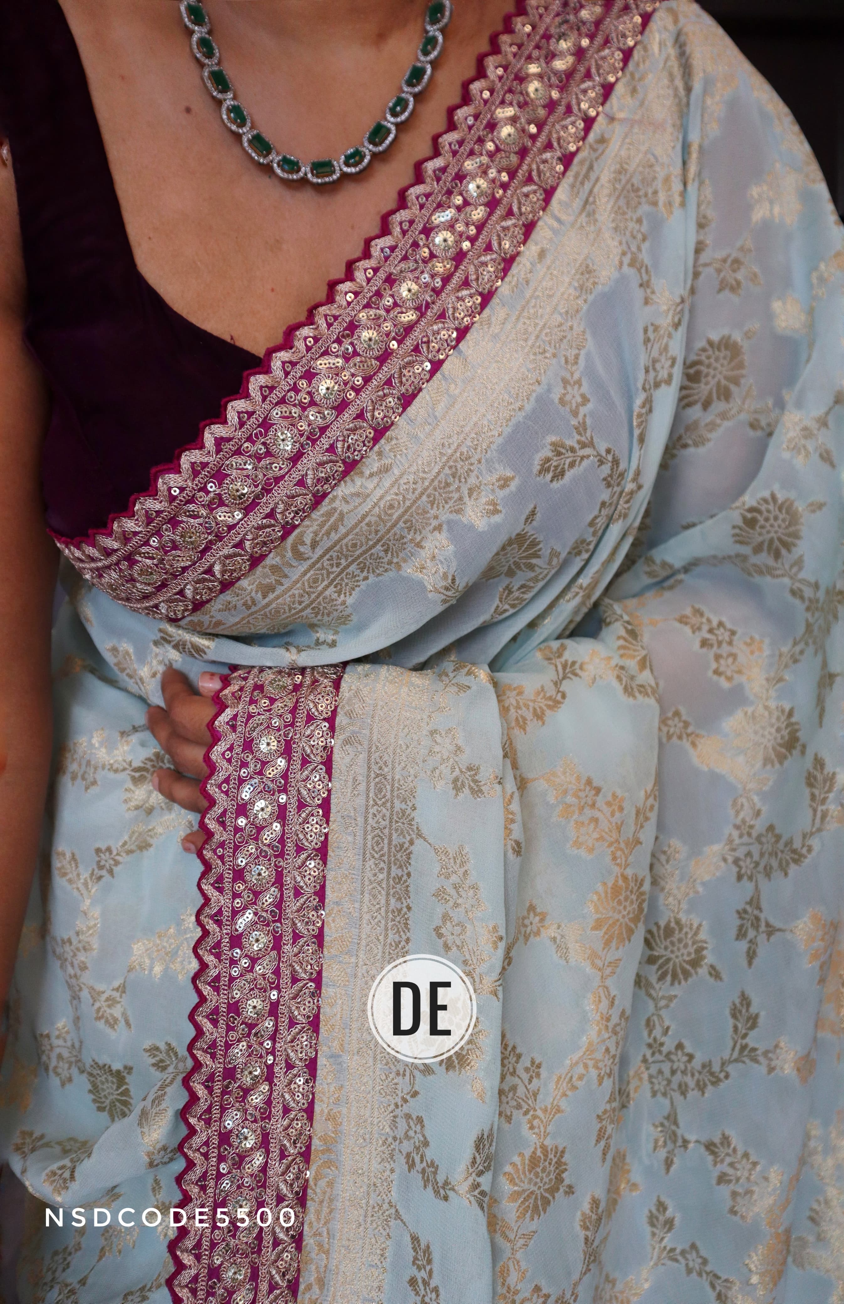 Adorn yourself in this beautiful and charming pure khaddi georgette designer saree in sabyasachi scallop intricate borders